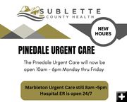 After reviewing patient visit data, Sublette County Health is adjusting Pinedale Urgent Care hours to better match community needs," said Bill Patten, Interim CEO of Sublette County Health. "We see lower demand in the mornings and increased use in the evenings