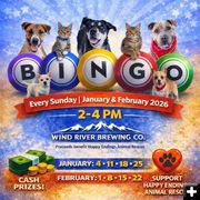Everyone is invited to play Bingo every Sunday during January and February at Wind River Brewing in Pinedale from 2-4PM. Proceeds benefit Happy Endings Animal Rescue.