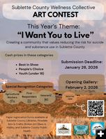 The Sublette Prevention Coalition is hosting an Art Contest for suicide awareness. This year’s theme is "I Want You to Live." There will be cash prizes in these categories: Best in Show, People’s Choice, Youth (under 18). Special recognition categories are Agr