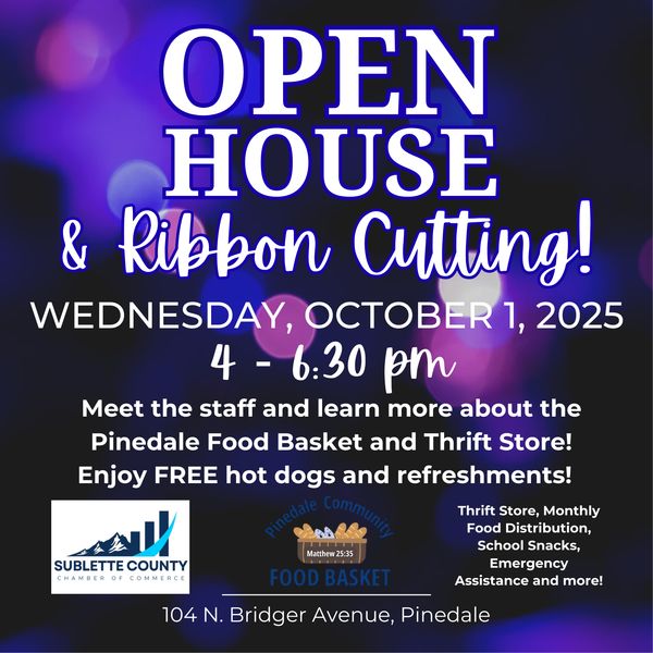 The Sublette County Chamber of Commerce invites everyone to the Open House and Ribbon Cutting Celebration at the Pinedale Community Food Basket and Thrift Store on Wednesday, October 1st from 4 to 6:30pm. Join the Chamber and our friends at the Food Basket / Thrift Store to learn more about how they fund this service for the community. Meet their team, mingle with community members and enjoy a free hot dog and beverage.