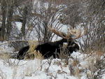 bull moose rests in the snow on the outskirts of Pinedale Tuesday.