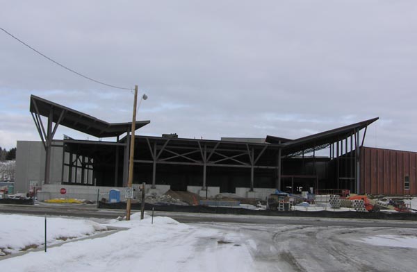 The Sublette County Aquatics Center is more than just a pool. The approximately seventy four thousand square feet houses a competitive pool, a leisure pool, a spa pool, two racquet ball courts, weight lifting room, running track, gymnasium, climbing wall, day care center, and three tennis courts. There are activities available for the entire family on different levels of interest and abilities. A party room will be available for families wanting to use the leisure pools water slide,submarine and current channel and retire to the room for the ice cream and cake. The high school is already scheduling events in the competition pool that will be State Championship level events. Construction is moving along well, the lap pool sides are set and backfilling behind the pool in preparation for pouring the decks and pool bottom is progressing rapidly. The pool filtration and heating equipment is being installed in preparation for filling the pool. State of the art starting and timing equipment as well as a new scoreboard will be installed prior to the opening. Masonry for the locker rooms is going up and electrical conduit is being run. Most of the rough plumbing is installed and heating and ventilating ducting is in place. The locker room area also includes two private locker rooms for families with small children who may require help in changing clothes. The leisure pool area is getting closer to being closed in so interior work can begin. Backfilling has begun and foundation work for the water slide tower has started. Some of the leisure pool filtration and heating equipment has been installed. Structural steel for the walking track is being installed and will be completed right up to the existing pool walls where it will be saw cut through and extended through and back out of the remodeled gymnasium to connect above the lobby area after the existing pool is removed. The walking track can be accessed from the lobby area or from the racquet ball courts located on the second floor. Access to the second floor can be accomplished from stairs at both ends of the lap pool, stairs in the lobby area or by an elevator in the lobby area. A climbing wall is located in the lobby area and should be a challenge to a novice or intermediate climber. The existing pool will be remodeled into a gymnasium that will include basketball, volleyball and tetherball. Update: January 7,