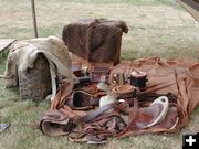 'Ol Jim' Hardee, (that's Ol, not Old, he told the kids), explained beaver trapping and the tools of the trapping trade. He demonstrated setting traps, let the students smell beaver castor oil, and had samples of the different kinds of animal skins the mountain man obtained. He had winter and summer pelts to show the difference between the fur thickness and why the winter fur was more desirable. He explained that these were hardy men who trapped beaver even in the coldest winter months to get the animals when the fur was the thickest, which meant more money for the trapper. This was a business, just like people work today, with a breed of men who were independent, work alone for months at a time, and self-sufficient for their own needs when they got injured or in trouble. He showed the classes the rounds of skinned beaver pelts that would be one of many in a typical mountain man's camp, if he was a good trapper. These pelts would be stretched on a willow branch bent into a circle to form a plew. The trapper would scrape off the fat and meat and leave the pelt rounds to dry at his camp. Ol' Jim also demonstrated the wood beaver press which was used to bundle furs into bales for transport to rendezvous where the mountain man received payment for his year-long trapping endeavors.