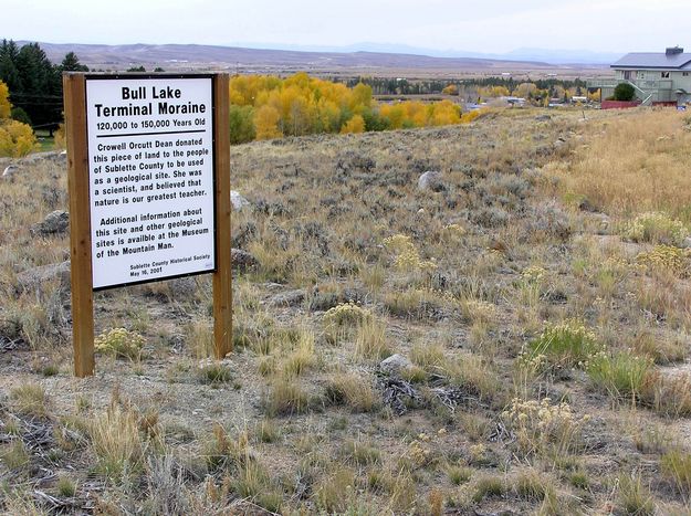 Sign on Orcutt Hill marking the location of the terminal moraine that created Fremont Lake. The land between Pinedale, north to Fremont Lake, is all of glacial origin. |