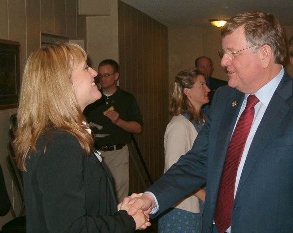 Kathy Sechrist shakes hands with Wyoming Governor Dave Fredenthal. |