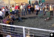 With names like the "Pigtails", "Raggedy Hams", "Big Bad Wolves", "Porkensteins" and "Pig Rodeoers", teams braved the slippery mud to try and grab a even more slippery squeeling pig and try to wrestle it into a barrel. Pig Wrestling and the Greased Pig Contest were two of the competitions that took place Sunday, July 31st, as part of the week-long events for the 2005 Sublette County Fair.