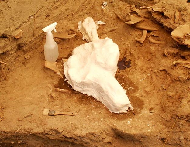 Plaster cast over a bison skull. Fragile bones are cast in plaster prior to removal to keep them intact for later analysis. |