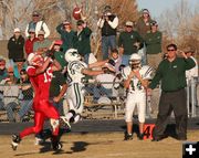 Jason Marincic (P#71) watches as Joe Steege (P#22) catches a pass for Pinedale's 2-point conversion.