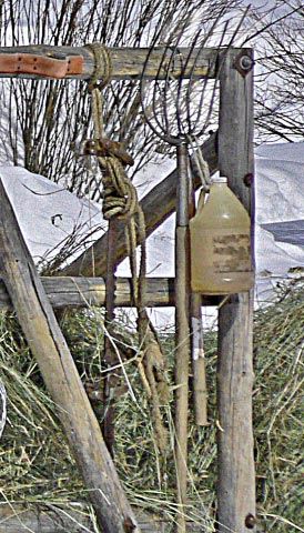 Finally, at the right rear is a strip of leather for baled hay hooks, a fence stretcher, pitch forks and a jug of drinking water. If the lid and surface of the water freeze, Lennie bangs them on the side of the hay rack. |