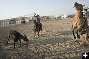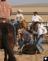 Once the mounted cowboys have roped the heifer, the ground team must finish securing the ropes. Normally, one rope is taken off and retied at a time, keeping the heifer secured. In the rush against the clock, the cowboys here have taken the ropes off both the front and hind legs at same time, leaving an instant where the heifer isn't secured. The header cowboy pushes the cow's head up and holds her nose while the heeler secures the hind legs. Had the heifer broken free, the entire roping process would have had to be done all over again.