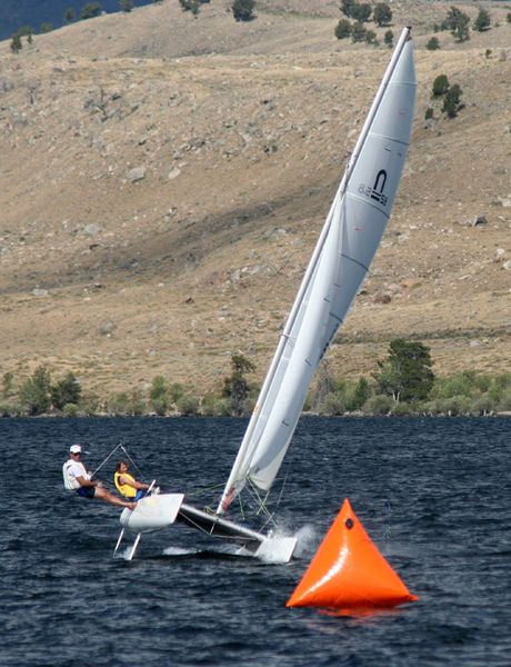 Cats require quick reflexes to stay upright in strong winds and to make the turns around the bouys. Brett Bingham from Ogden, Utah, skippered this catamaran. |