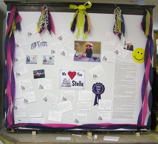 Stella McKinstry has worked for the University of Wyoming's Cooperative Extension Office for 60 years, as of April 15, 2006, as nutrition and food safety educator. Visitors to the Fair were invited to write comments on notecards and pin them up on this bulletin board display in the Exhibit Hall. |