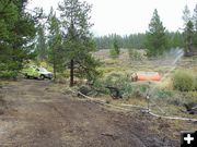 The Paulton engine crew prepares management action point 9 on September 14th. No, this isn't a swimming pool for the firefighters. Water is pumped from this 'orange pumpkin' cistern and runs through pipe to sprinklers layed along firelines. USFS photo.