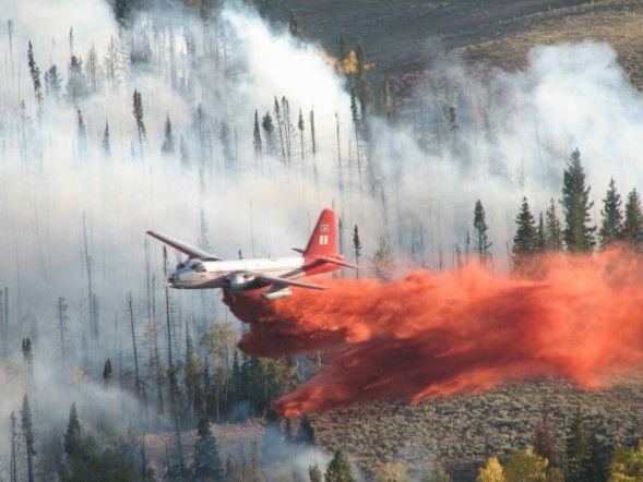 | Pinedale Online > News > September 2007 > Snow dampens Tanner Fire > Retardant Drop |