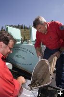 the bucket of Joseph Cocco, Pinedale Fisheries Technician, to be stocked