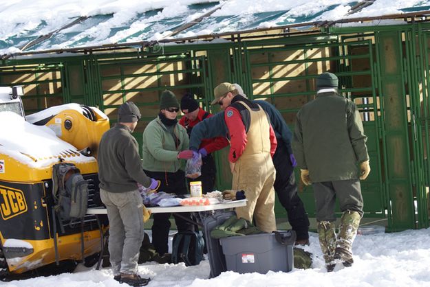 Pinedale Online > News > January 2008 > Elk trapped for brucellosis testing > Crew on scene