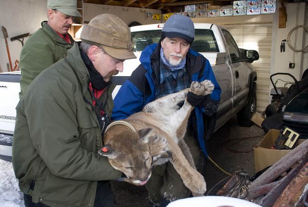 Wyoming Game and Fish biologist, Doug Brimeyer and Craighead Beringia South researcher, Howard Quigley carry a tranquilized female mountain from a garage near Hoback Junction, as Game and Fish employee, Dave Hyde, looks on. Photos by Mark Gocke, WGFD |