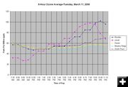 8-Hour Ozone Averages for Tuesday, March 11, 2008 for 5 air quality monitoring stations in and near the Upper Green River Valley (partial day readings). Note: Wyoming DEQ Maximum Allowed Ambient Air Quality Standard for 8-hour Ozone average is 84 ppb (.08 ppm).