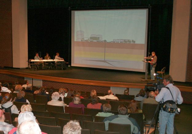 Dr. Theo Colburn speaks during the ozone forum on Tuesday. PBS videod the event and interviewed members of the community. The forum was broadcast live on KPIN 101.1 FM radio. |
