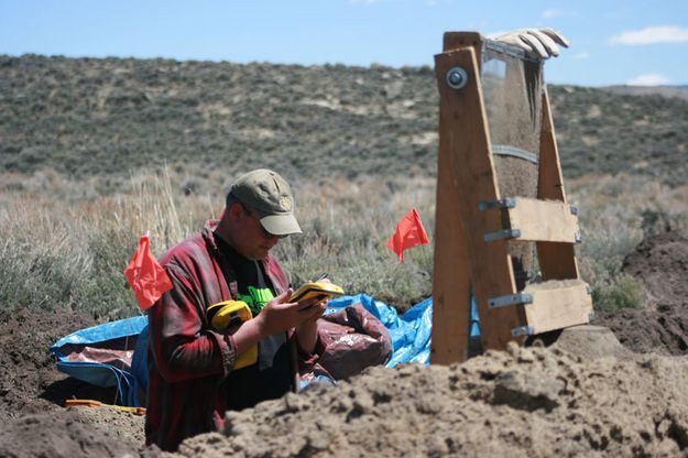 BLM archaeologist Rob Schweitzer records data from a backhoe test pit dug at the site. |