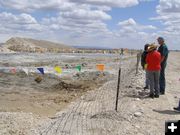 Then everyone quickly carpooled and formed a caravan for the trip to the Anticline. By about 1:30 everyone had arrived at the Questar site, which had been previously approved by the company and the BLM. The site was an enormous scraped-off area surrounded by high mounds of soil. The location dwarfed the group, which would have filled most of a meeting room in Pinedale. Two large pits occupied the north edge of the site, but there was no major equipment or active work occurring. People pulled out folding chairs and blankets and collected around a small trailer that had been equipped as a speaker’s platform. An acrid smell irritated eyes, noses and throats throughout the two-hour sit-in.
