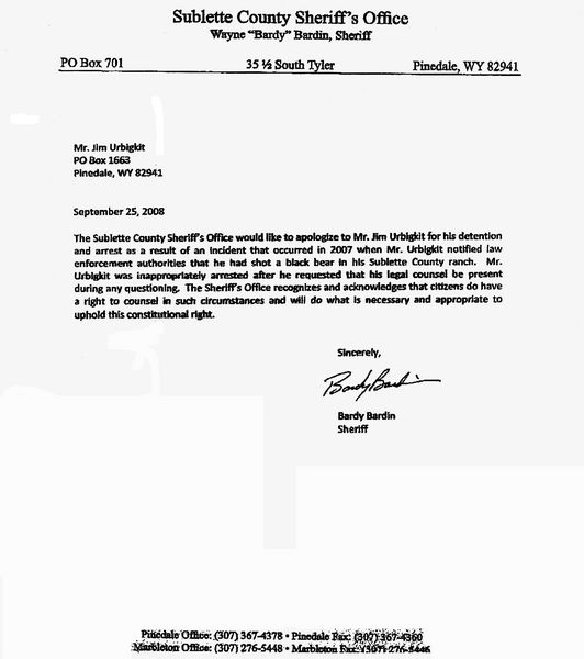 Official letter of apology from Sublette County Sheriff "Bardy" Bardin. |