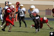 Rocky Mountain Grizzlies player Carlos Hernandez carries the ball through the Big Piney Punchers.