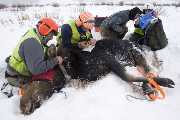 Members of a wildlife capture crew, Will Loeper and Josh Taylor, fit a hobbled cow moose with a GPS collar and record data while University of Wyoming graduate student, Scott Becker, and veterinarian Jeanne Ross view an ultrasound image to determine the animal's rump fat. Photo by Mark Gocke-WGFD. |