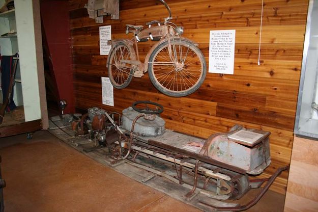 Glen Wise built this motorized tobaggan around 1940 for his three small children to use to get to school. He also used it to get the the light plant that generated electricity for Pinedale. |