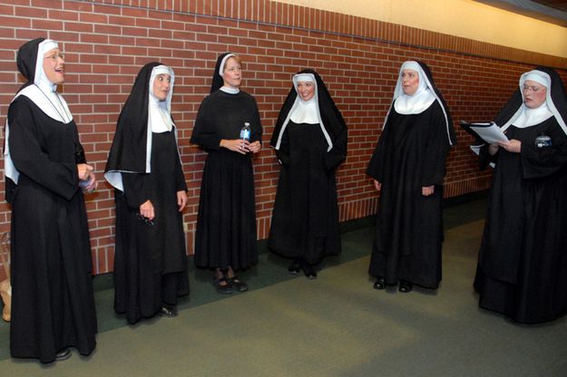Several of the nuns take to the halls to harmonize before rehearsal beings. |
