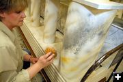 Director John Goss, left, and light and sound engineer Frank Roncalio check out the scenery that was just attached to the batten and raised before it painted to become the background of the Abbey.