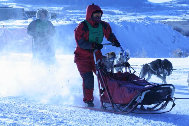 Stacy's (#8, in red) 6-dog team ran the 14-mile race in about an hour. She took 1st place overall. |