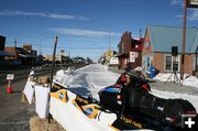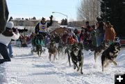 A big crowd waited along the race course starting line in Pinedale. There was high enthusiasm and everyone enjoying watching the dogs and listening to the lively music while they waited for the race to begin. "Dogs Rule" banners were attached to the rope marking the race course.