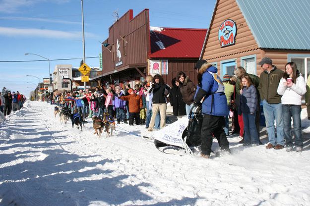 Grant Beck, from Yellowknife NWT, Canada, takes off from the Pinedale starting line. Beck has lived and worked with dogs all his life and has won hundreds of races. He is 59. Beck is a veteran of the IPSSSDR and Pinedale is pleased to once again welcome him to Wyoming. |