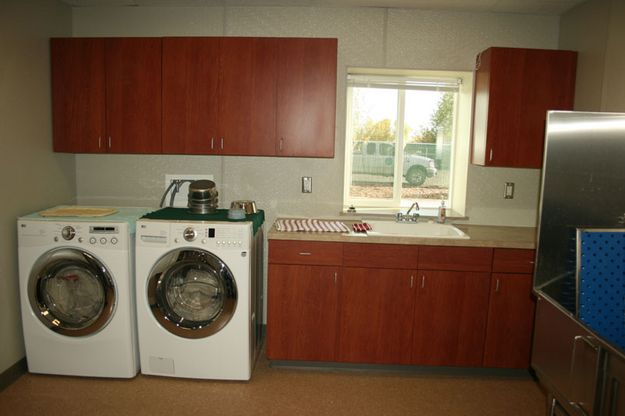 The work area has plenty of cupboards for storage, a washer and dryer to launder animal bedding, an examination table, and wash area. The room has fiberglass washdown walls for easy cleaning. |