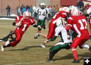 Austin Doyle (BP22) is surrounded Wranglers Jacob Brunette (P20) and Aaron Belton (P74) at the end of a 10-yard run.