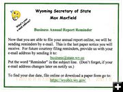 Wyoming Secretary of State Max Maxfield has sent out notices to Wyoming businesses informing them that his office will no longer be mailing out paper notice reminders to file annual business reports. The reason given is that businesses are now able to file the