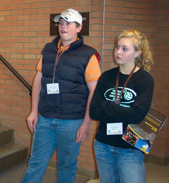 Ethan Wolaver and Sydney Pape listen to Dr. Ken Mills from the Wyoming State Vet Lab. Photo courtesy Robin Schamber, University of Wyoming, Sublette County Extension 4-H & Youth Development Educator. |