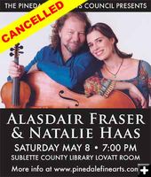 The Pinedale Fine Arts Council regrets they must cancel the Alistair Fraser & Natalie Haas concert which was scheduled for Saturday, May 8th due to a death in the artist’s family. PFAC hopes to reschedule at a later date.