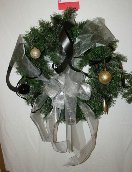 Jennifer Gibson made this wreath on behalf of Encana. She used evergreen boughs and decorated it with silver and black ribbons, adding gold and black ornaments. |