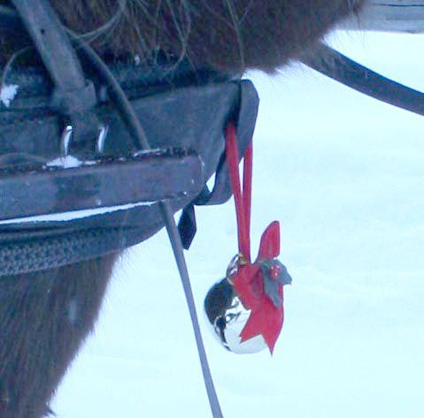 A single bell dangles from Maybelle's front breast strap. Other bells and on the sled and horse harness. |
