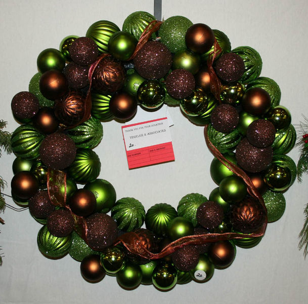 Tegeler & Associates created a unique wreath using a variety of green and copper-colored holiday ornament balls, entwined with a copper-colored see-through fabric ribbon. |