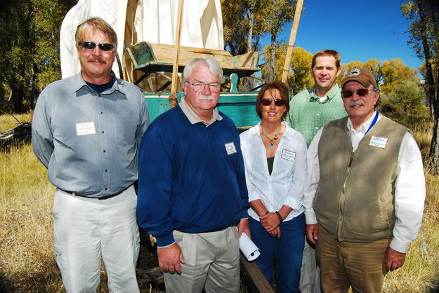 Representatives of the BLM and companies providing funding for the New Fork River Crossing Historical Park. (left to right). John Huston (BLM), Larry Elcock (Rocky Mountain Power), Aimee Davison (Shell), Chris Nelson (Rocky Mountain Power), Sam Drucker (BLM). Not pictured Cally McKee (Ultra). Photo courtesy Sublette County Historical Society. |