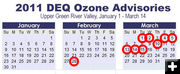 Upper Green River Basin, Wyo. - The Air Quality Division (AQD) of Wyoming’s Department of Environmental Quality (DEQ), in conjunction with the Wyoming Department of Health (WDH), is issuing an ozone advisory for Saturday, March 5, 2011, for the Upper Green Riv