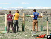 Crew Leader Amy Healy works on digging out a post hole while brothers Jade and Tyler Shevling help. Amy is from Colorado and attends Univ N Colorado. Jade and Tyler are from Gillette.