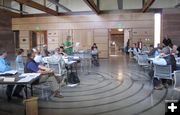 Participants collecting and socializing on the first morning of the conference at the Pinedale Library.