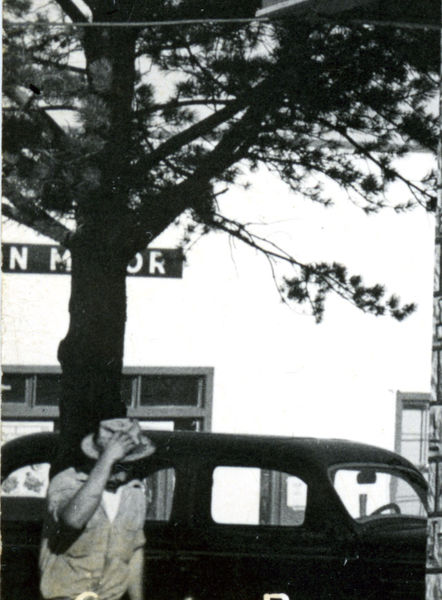 Postcard Detail: Note the mature evergreen tree to the left, near the entry door. A fire hydrant is there now. The building across the street was a car repair shop and dealership. Ann Noble's Pinedale Centennial History book is a great resource for photos of early Pinedale (see sources at the end of this article) |
