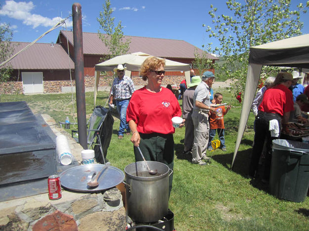 Gloria Thomas, firefighter and wife of Fire Chief Richard Thomas, slings beans. |