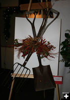 This unique display used elk antlers, sage, holly berries and red ribbon.