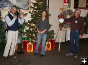 Jay Fear (left) served as auctioneer. Sam Drucker (right), a Sublette County Historical Society Board of Director, holds a wreath during the bidding.